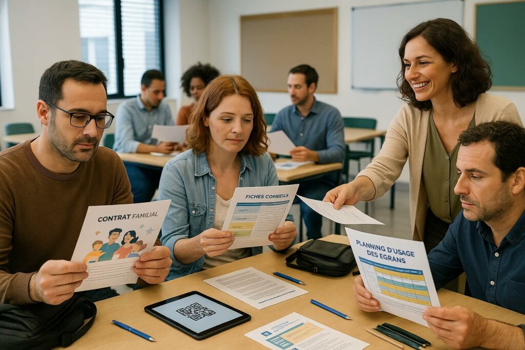 Chaque atelier fournit des ressources pratiques immédiatement applicables : modèles de contrats familiaux, guides par âge et fiches techniques. Nos participants repartent avec des solutions prêtes à l'emploi.